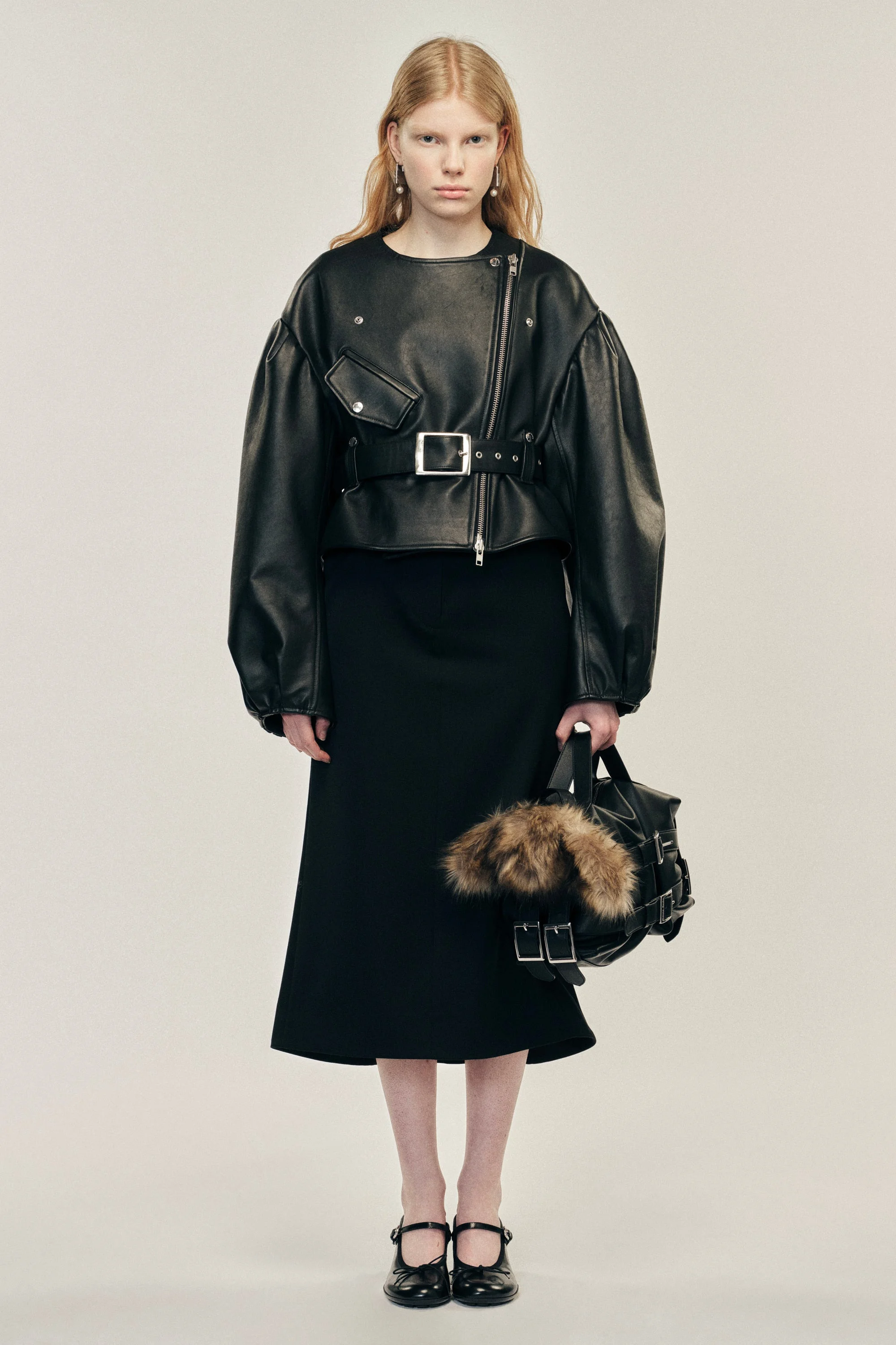 An alternative take on a classic leather jacket, its collarless cropped design pairs perfectly with a high waisted skirt. The hem has a subtle peplum shape that can be exaggerated with the integrated belt detail. The model is wearing this style with the Multi Belt Loop Kick Back Skirt. Product Details Structured leather biker jacket - From Look 25 on the runway - Belt buckle detail at centre - Signature puff sleeve - Flap and zip pockets - Cropped hem - Slim fit Composition: 100% Cow Leather Lining: 100% Viscose SKU: 6131 0457 BLACK Size & Fit Model is wearing size 8.