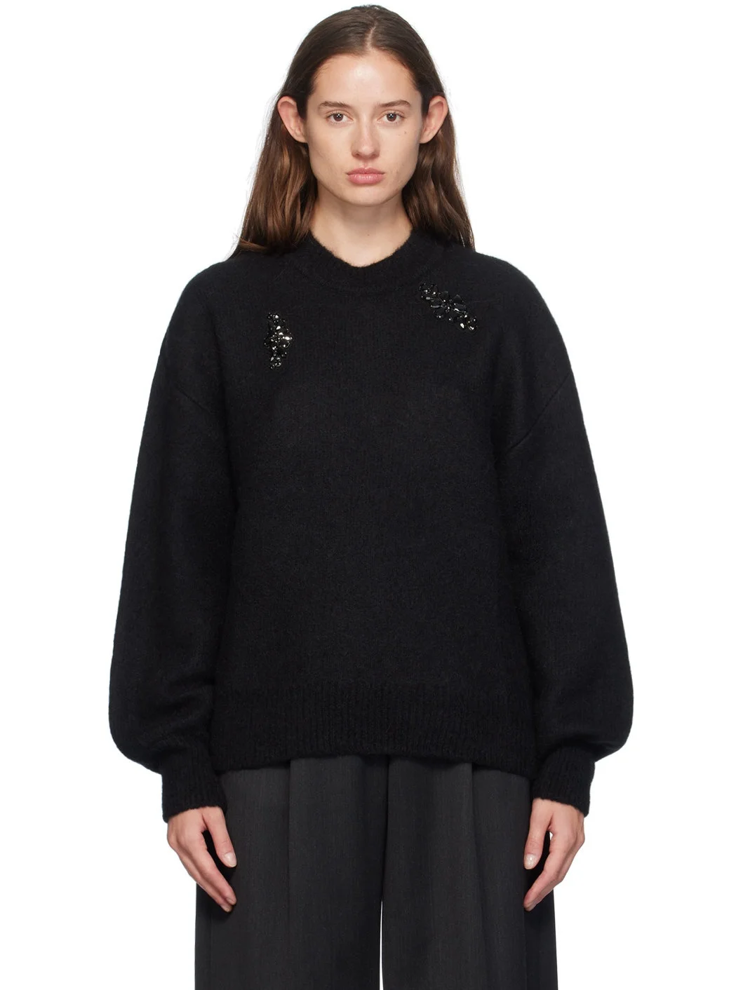 Brushed knit baby alpaca-and merino wool-blend sweater. · Rib knit crewneck, hem, and cuffs · Crystal-cut appliques at chest · Dropped shoulders Supplier color: Black/Jet 49% baby alpaca, 21% merino wool, 30% recycled nylon. Made in Portugal 242405F096000
