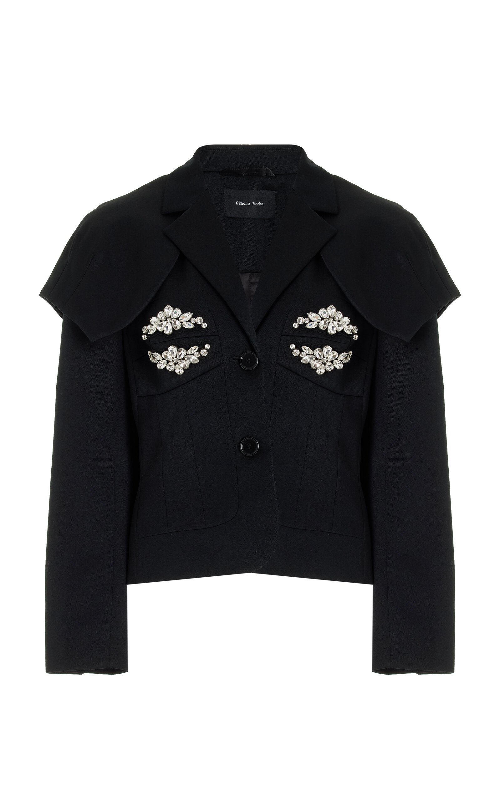 With a penchant for dreamy, feminine looks and intriguing textile development, Simone Rocha delivers an aesthetic that is both evocative and pretty—a modern take on classical style. This fitted blazer is crafted from a virgin-wool suiting blend and features diamante cups. PRODUCT DETAILS - Fall/Winter '24 - Partial button fastening through front - Composition: 45% Virgin Wool; 55% Polyester; Lining: 100% Viscose (Excl Embellishment) - Designer color: Clay - Dry clean - Made in Portugal SIZE & FIT - Our model is wearing a size UK 6 - Model is 5'10" with a 33" bust, 24" waist, and 36" hip - Designed for a tailored fit