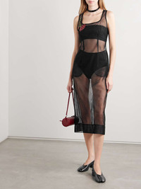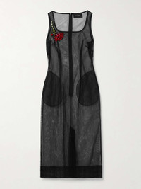 EDITORS'NOTES The crystal flower on Simone Rocha's midi dress can be seen throughout the brand's Spring '25 collection - it's inspired by Pina Bausch's dance piece Nelken , which is performed on a stage strewn with 8,000 pink carnations. Cut from black mesh, it has an elegant square neckline and slim bodice emphasized by darting. Temper its sheerness with a tonal slip. SIZE & FIT Model measurements: - Fits true to size, take your normal size - Intended for a slightly loose fit - Lightweight, sheer, slightly stretchy fabric - Model is 177cm/ 5'10" and is wearing a UK 8 - Bust: 79cm/ 31" - Waist: 61cm/ 24" - Hip: 88.9cm/ 35" DETAILS & CARE - Black mesh - Concealed zip fastening along back - 100% polyamide - Hand wash or dry clean