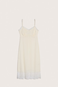 A slip dress made in a silk mix crepe de chine, a classic style from the brand. Featuring a seasonal floral embroidered lace trim and adjustable straps, the perfect layering piece to be worn under our tulle dresses. Product Details Silk mix crepe de chine slip dress - Sweetheart neckline - Floral embroidered lace trim - Adjustable shoulder straps - Gathered bust Composition: Self: 73% Acrylic, 27% Silk Trims: 100% Nylon Thread: 100% Viscose SKU: 7210 0514 CREAM