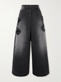 Under Simone Rocha, even casual items like jeans get special treatment. This pair is made from washed denim, ripped and shredded through the baggy legs and hand-embellished with crystals. We love how they puddle over ballet flats. Size & Fit - Fits true to size, take your normal size - Intended to be worn loose and low on the hips - Mid-weight, non-stretchy denim - Model is 177cm/ 5'10" and is wearing a UK 8 Model measurements: - Bust: 85cm/ 33.5" - Waist: 65cm/ 25.5" - Hip: 91cm/ 36" Details & Care - Black denim - Button and concealed zip fastening at front - 100% cotton - Hand wash - Designer wash: Jet