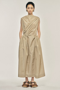 The silhouette of this taffeta dress is relaxed yet structured, the gathered waist detail adds volume to the dress. It features architectural-like draping across the bodice that creates a relaxed fit above the waist. Product Details Taffeta dress - Exaggerated hip detail - Rouleau button placket - Draped detail at front Composition: 71% Acetate 29% Polyester SKU: 7415 1281 STONE Size & Fit Model is wearing size 8.