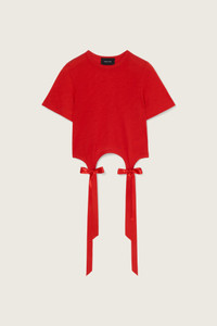 A cropped t-shirt in a soft fine jersey fabrication. Designed for a more fitted silhouette, featuring long satin bow tails at the front. Product Details Fine jersey t-shirt - Satin bow tail accents - Scoop neck and gathered darts - Cropped hem Composition: 100% Lyocell Trim: 100% Polyester SKU: 5223 0571 RED