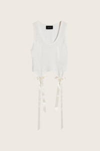 Simone Rocha cropped tank top in a soft fine jersey fabrication. Designed for a more fitted silhouette, featuring long satin bow tails at the front. Product Details Fine jersey tank top - Satin bow tail accents - Scoop neck and gathered darts - Cropped hem Composition: Self: 100% Cotton Trim: 100% Polyester Ribbon SKU: 5222 0571 IVORY