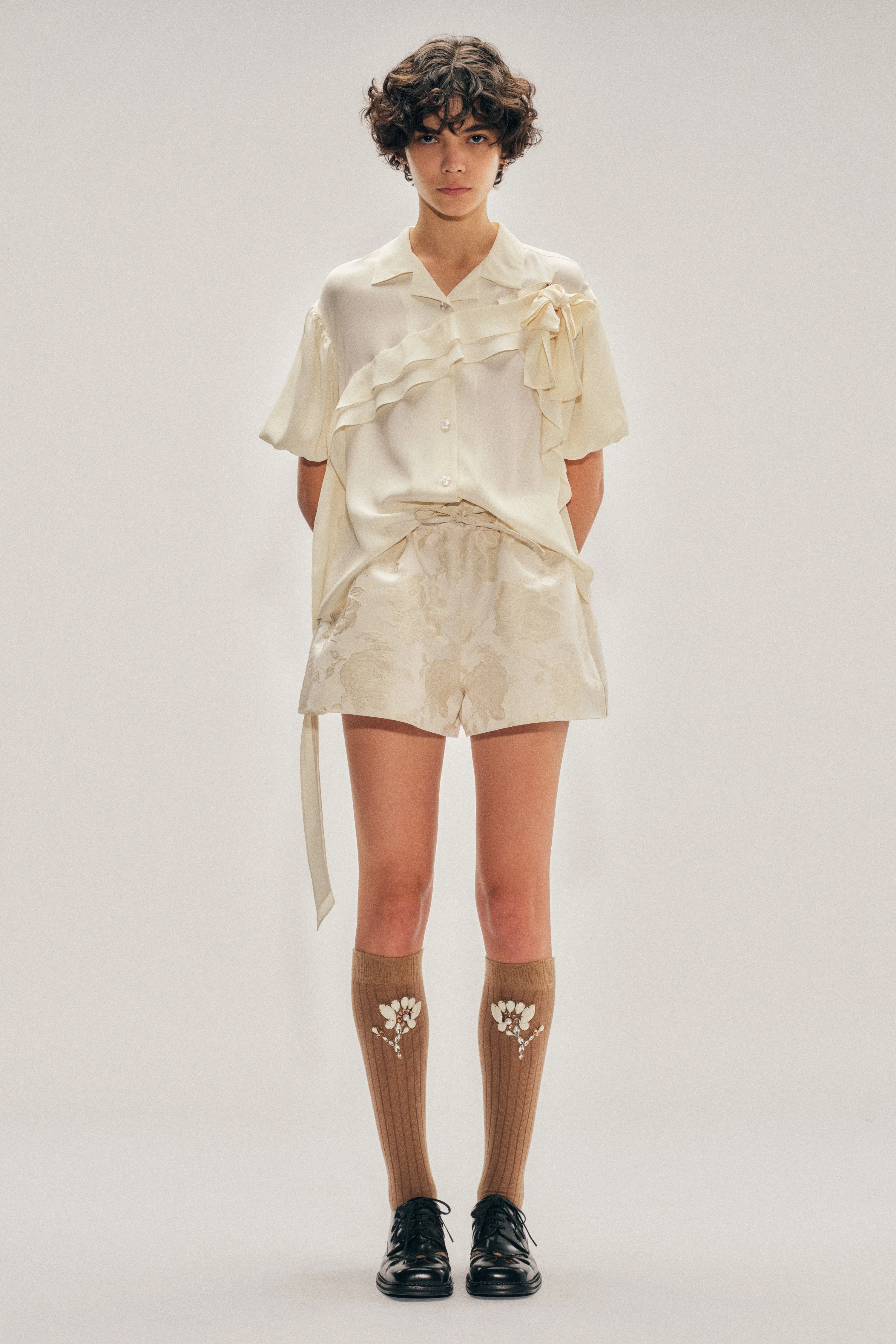 Elasticated shorts in a rose satin brocade fabrication, its silhouette is made for an easy fit with an adjustable drawstring. Product Details Brocade drawstring shorts - From Look 19 on the runway - Elasticated waist - Adjustable drawstring Composition: SELF1: 100% PL / LINING: 100% CU SKU: 4205 1236 CREAM