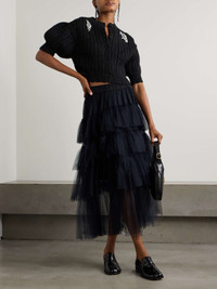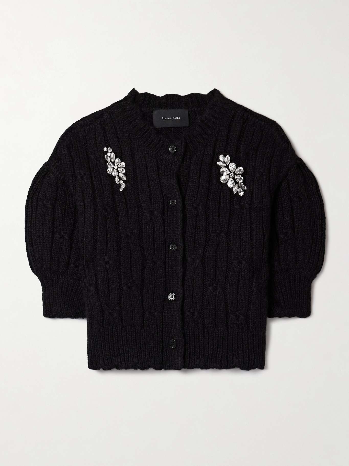 EDITORS'NOTES Simone Rocha's cardigan is brimming with details that make it feel personal and special. In a cropped length, it's cable-knitted from alpaca-blend, which is joyfully springy and fluffy. Ribbed, scalloped edges and crystal embellishments showcase the designer's sense of whimsy. SIZE & FIT Model measurements: - Fits true to size, take your normal size - Designed for a slim fit - Chunky knit - Model is 180cm/ 5'11" and is wearing a size Small - Bust: 80cm/ 31.5" - Waist: 65cm/ 25.5" - Hip: 89cm/ 35" DETAILS & CARE - Black alpaca-blend - Button fastenings through front - 68% alpaca, 22% nylon, 10% merino wool - Dry clean