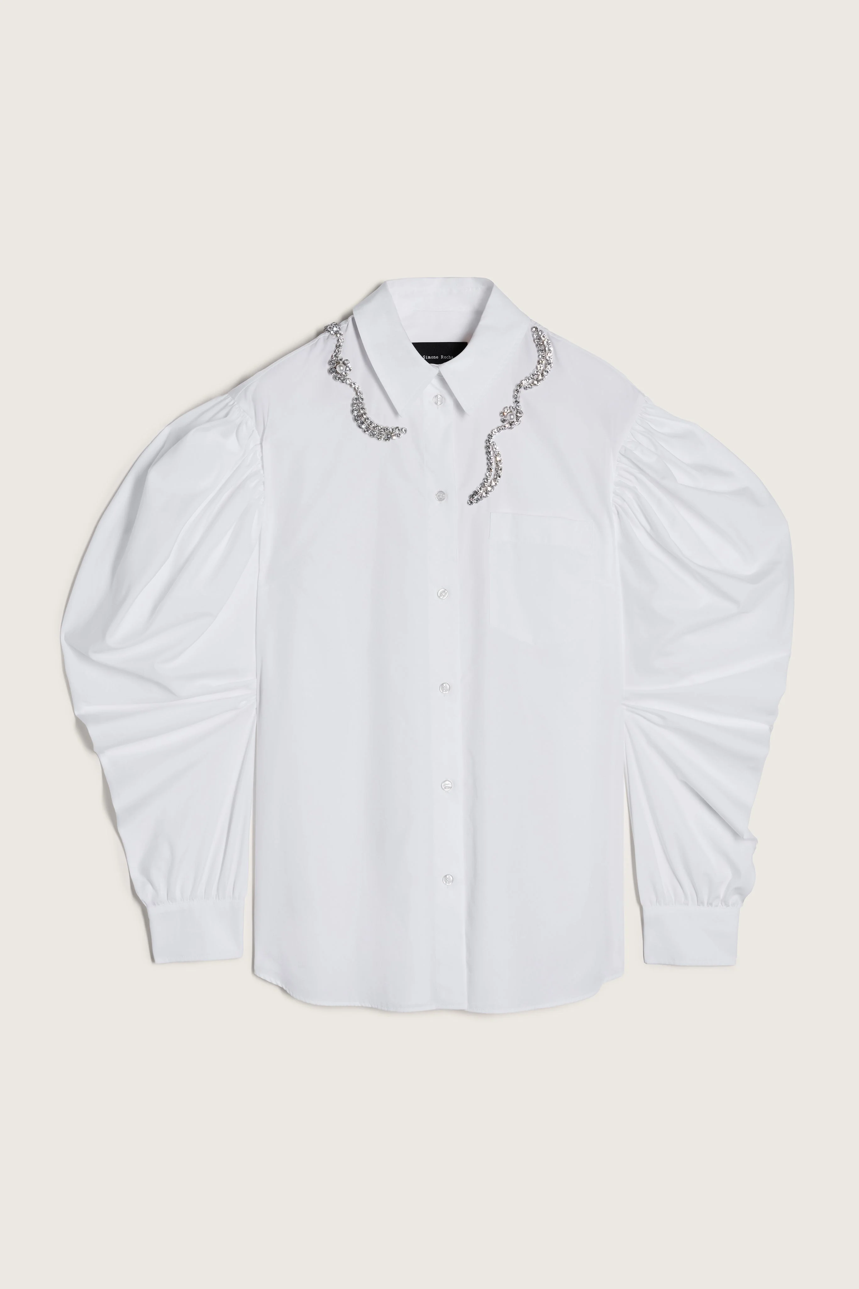 A cotton poplin shirt with pointed collar and gathered, draped sleeves. Crystal and faux pearl embellishments update the neckline for a signature look. Product Details Cotton poplin button-up shirt - Seasonal crystal embellishment - Exaggerated puff sleeve - Relaxed fit Composition: 100% COTTON (EXCL. EMBELLISHMENT) SKU: 5401TB 1287 WHITE/PEARL/CLEAR