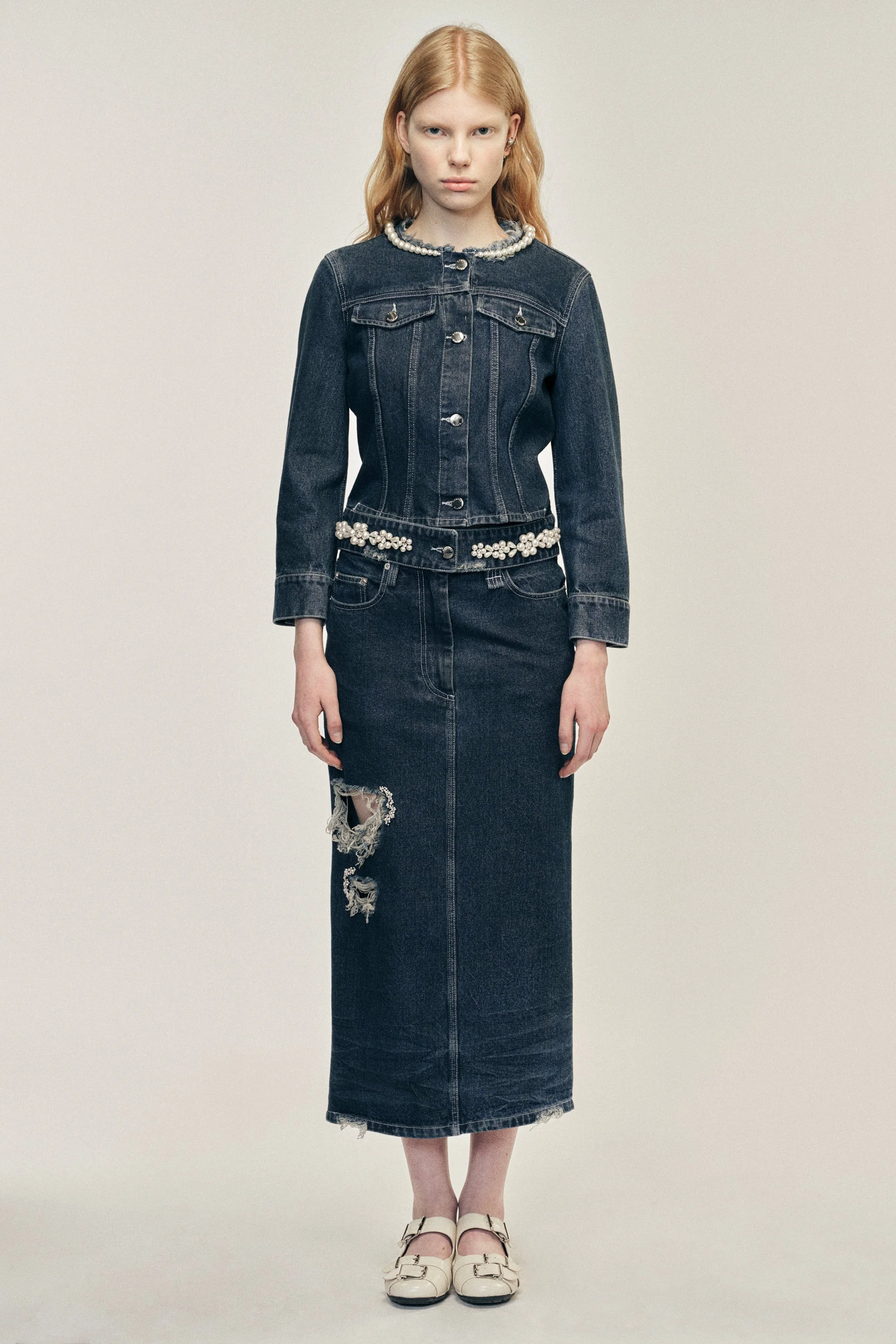 A continuation on Simone Rocha's denim offering, this season's kick back skirt is constructed in a distressed denim and features embellishments throughout. Due to the nature of the wash and finishing each piece is unique, no two are exactly alike. Product Details Distressed cotton denim midi skirt - From Look 24 on the runway - Signature embellishment - Beaded label at back - Kick pleats at back - High-waist fit Composition: 100% Cotton (Excluding Embellishment) SKU: 3165B 1231D DISTRESSED BLUE/PEARL/CLEAR Size & Fit Model is wearing size 6.