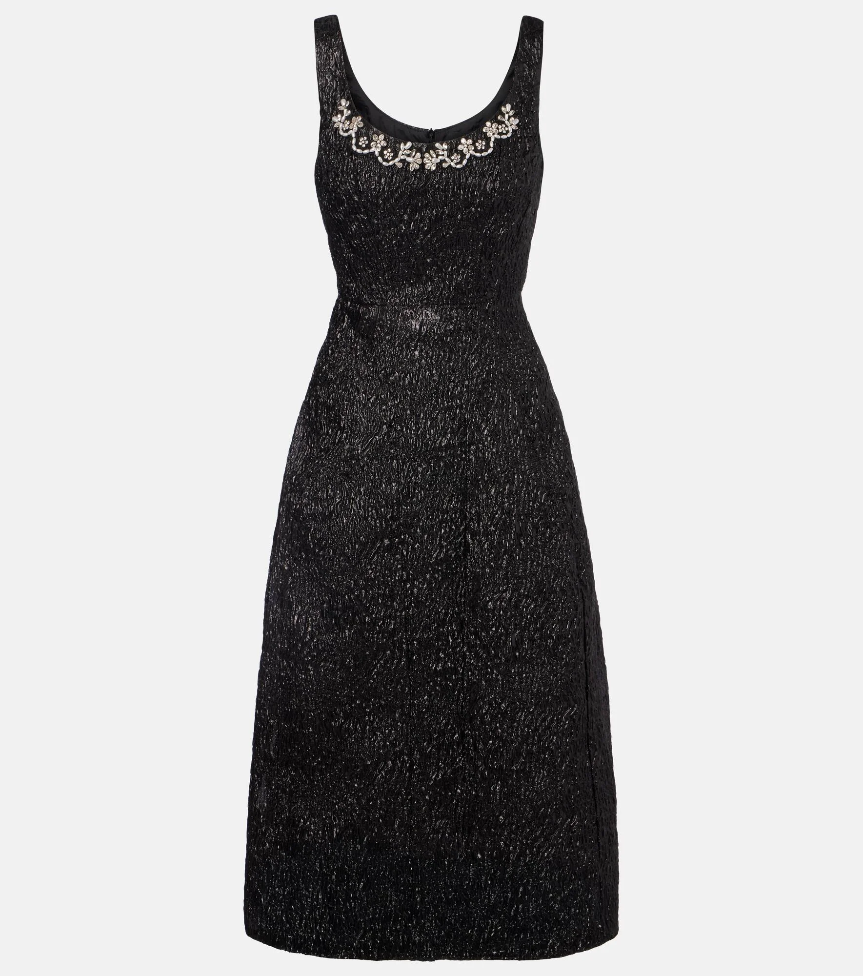 Simone Rocha's in-house developed fabrications are balanced with silhouette and embellishment to create a modern form of femininity. Made in Portugal from shimmering lame fabric, this cocktail dress features crystal embellishments bordering the neckline and a classic A-line silhouette. Product Details - Material: 39% polyester, 37% metallic fibres, 24% polyamide - Care instructions: dry clean - Made in Portugal - Designer color name: Black - Item color: black - Lining: 60% acetate, 40% cupro - Hardware color: silver - Pockets: side slit pockets - Closure: concealed zipped back - Hem: straight - Item number: P01112224 Size & Fit - Fits large to size - we recommend trying one size smaller - Relaxed fit from the hip down - Non-stretchy fabric - The model seen in the picture is 178cm-5'10" and wearing a size UK 6
