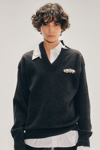 V-neck knitted jumper in charcoal merino wool with offset bite in the neckline for layered styling. Crystal and faux pearl embellishment at the chest, merging subversive edge with romantic detail. Product Details Merino wool knit jumper - From Look 31 on the runway - Signature embellishment - Cut out "bite" detail at neck and back - Rib knit neck, hem, and cuffs Composition: 93%WV 1%EA 6%PA (EXCL EMBELLISHMENT) SKU: LMK10MB 0660 CHARCOAL/PEARL/CLEAR