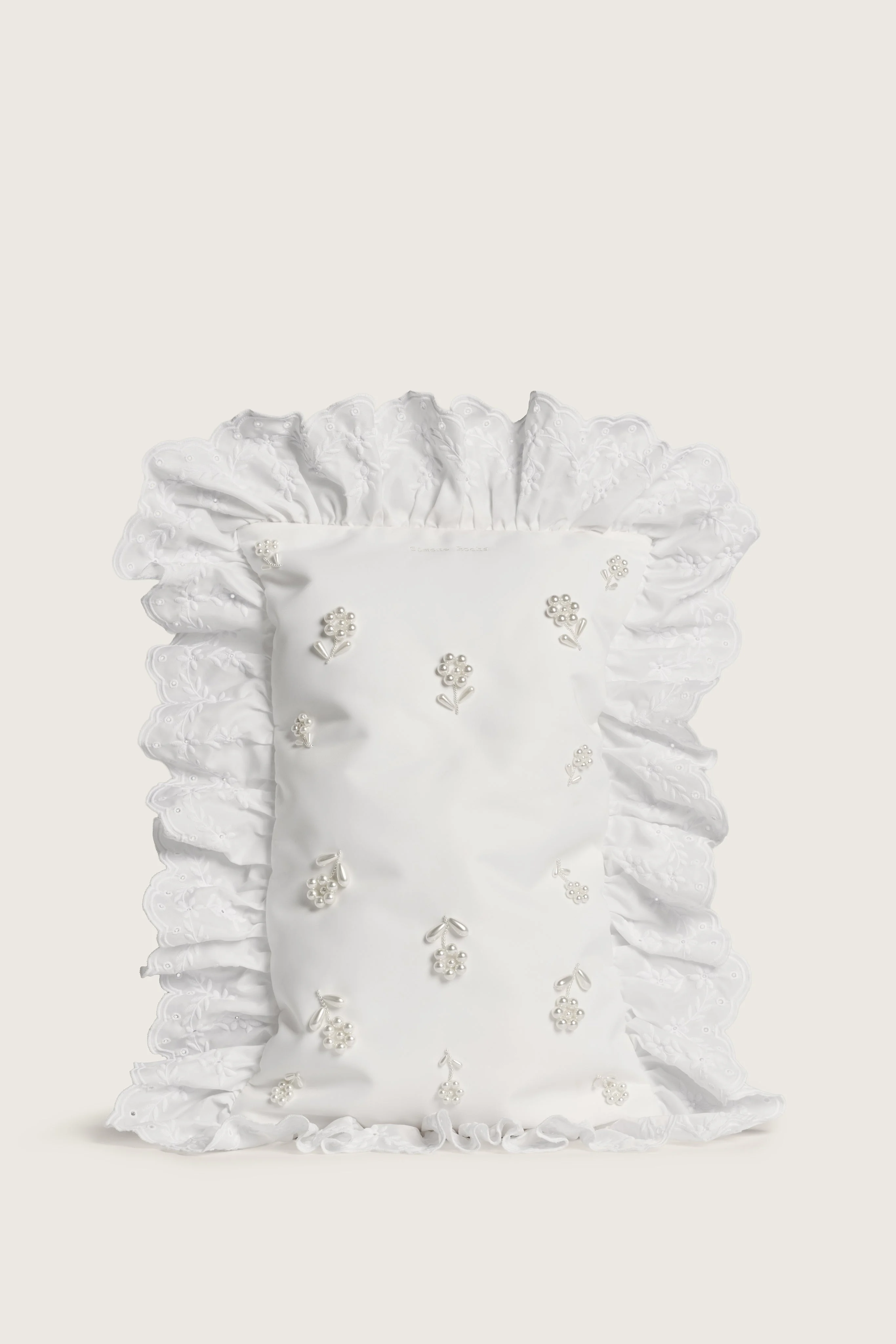 An oversize clutch bag crafted in padded nylon, featuring embroidered trims reminiscent of traditional pillowcases. Secures with a magnetic snap to one side. Product Details Nylon clutch bag - Signature beading - Broderie anglaise trim - Magnetic hinge frame closure - Inner pocket Composition: OUTER: 100% PL / LINING: 100% CO (EXCL EMB) SKU: BAG218B 0761 WHITE/PEARL