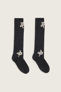 A pair of ribbed wool socks embellished with pearl and crystals in a rose motif. It can be worn below the knee or scrunched for a more sporty styling. Embellished socks have become a signature accessory for Simone Rocha. Product Details Wool knit socks - Signature embellishment - Knee length Composition: 80% Wool 18% Polyamide 2% Elastane (Excluding Embellishment) SKU: SOCK63B 0634 CHARCOAL/PEARL/CLEAR