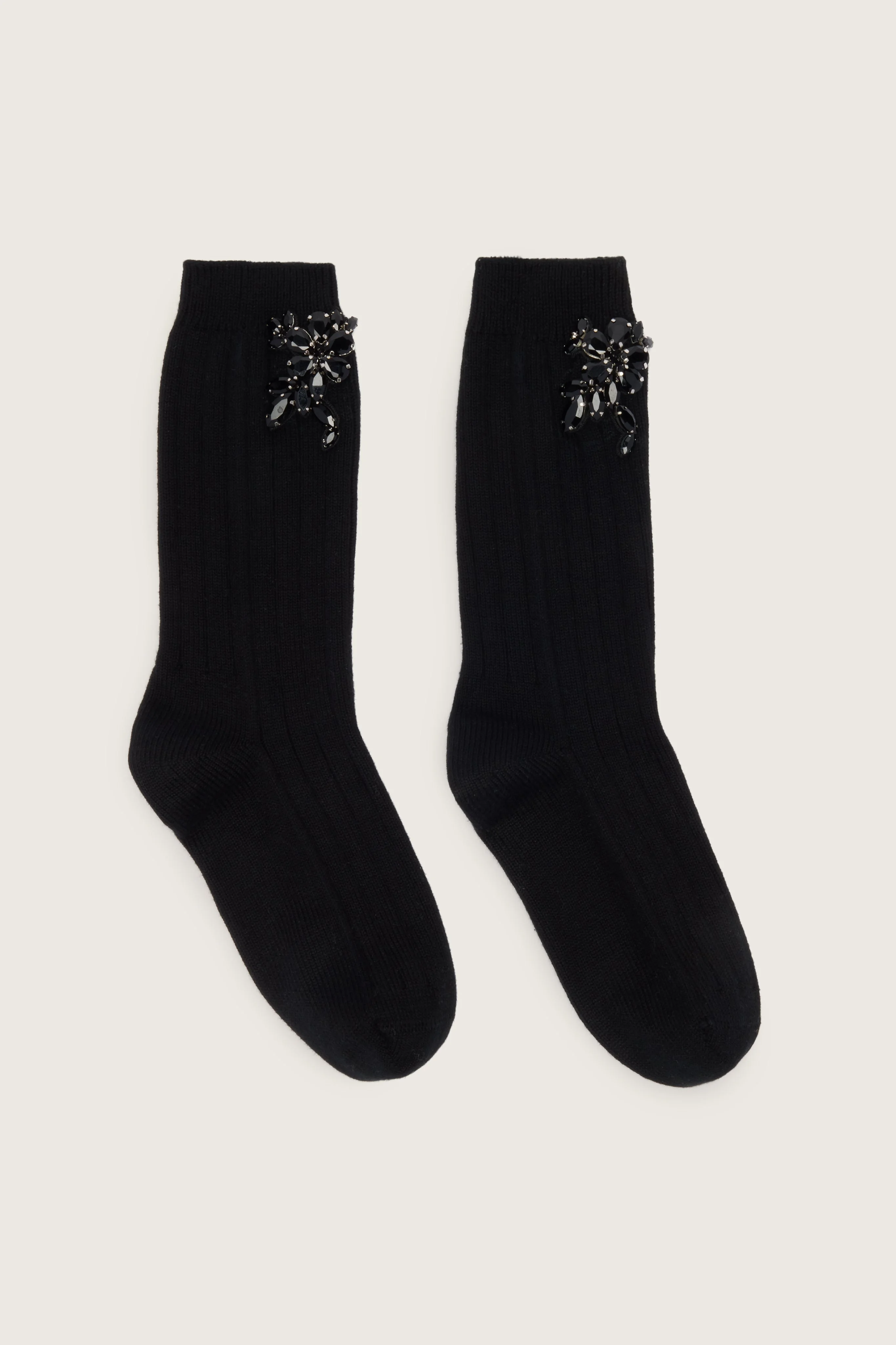 Ankle socks knit from a wool blend yarn, it features a tonal rose embellishment comprised of signature jet black crystals. Embellished socks have become a signature accessory for Simone Rocha. Product Details Wool knit socks - Signature embellishment - Ankle length Composition: 80% Wool 18% Polyamide 2% Elastane (Excluding Embellishment) SKU: SOCK66B 0634 BLACK/JET