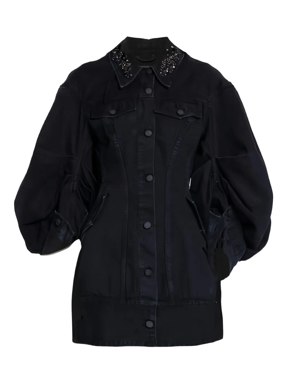 embellished denim jacket Highlights - Black - Front button fastening - Two chest flap pockets - Long wide sleeves - Two side flap pockets Imported