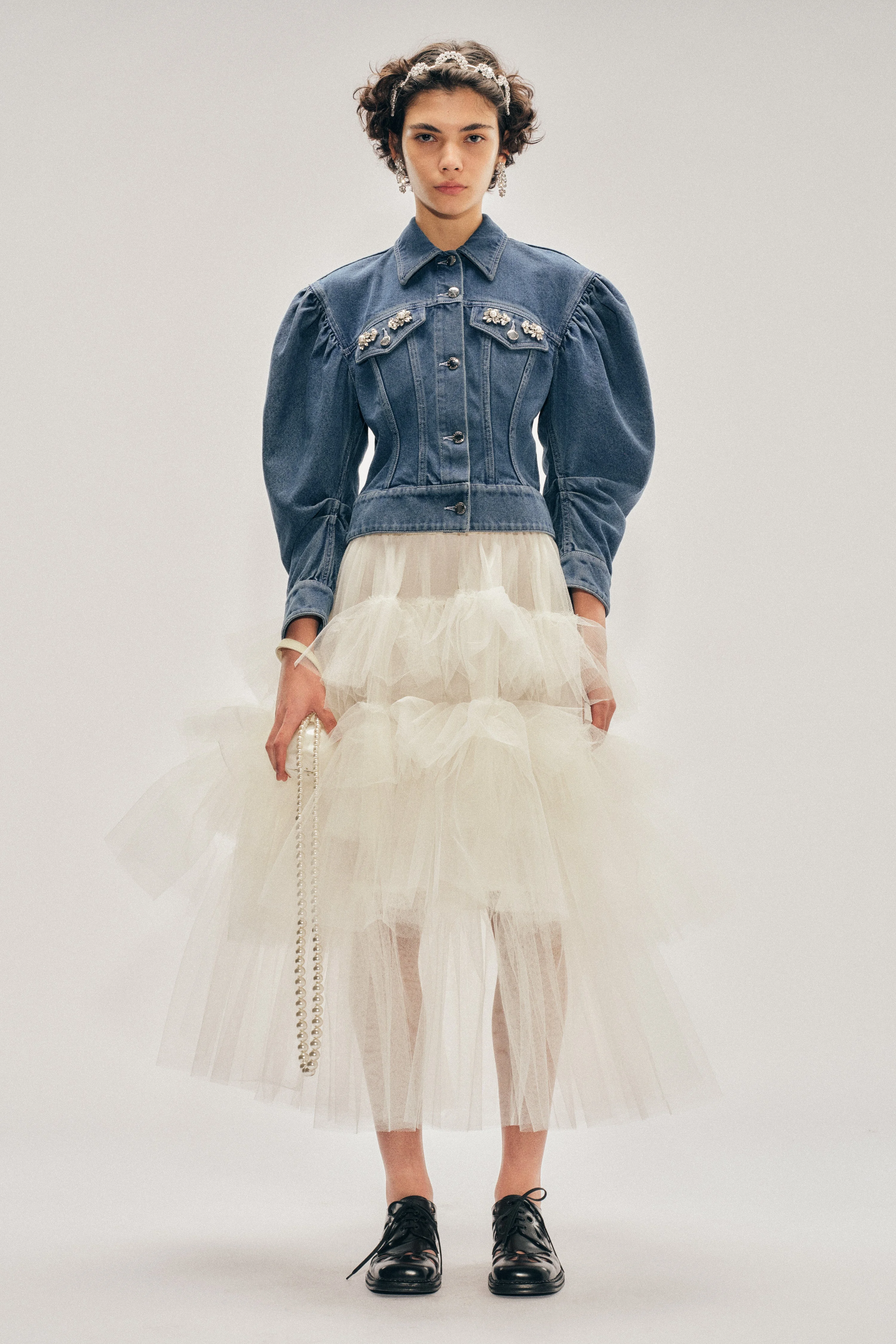 Sculpted jacket in washed denim with skewed proportions for a playful Simone Rocha sensibility. Cinched at the waist with voluminous puffed sleeves, each chest pocket is embellished with crystals and faux pearls. Product Details Cropped cotton denim jacket - Seasonal crystal embellishment - Signature puff sleeve - Beaded label at back Composition: SELF: 100% COTTON PATCH: 100% LEATHER (EXCL EMBELLISHMENT) SKU: 6164B 1231 INDIGO/PEARL/CLEAR