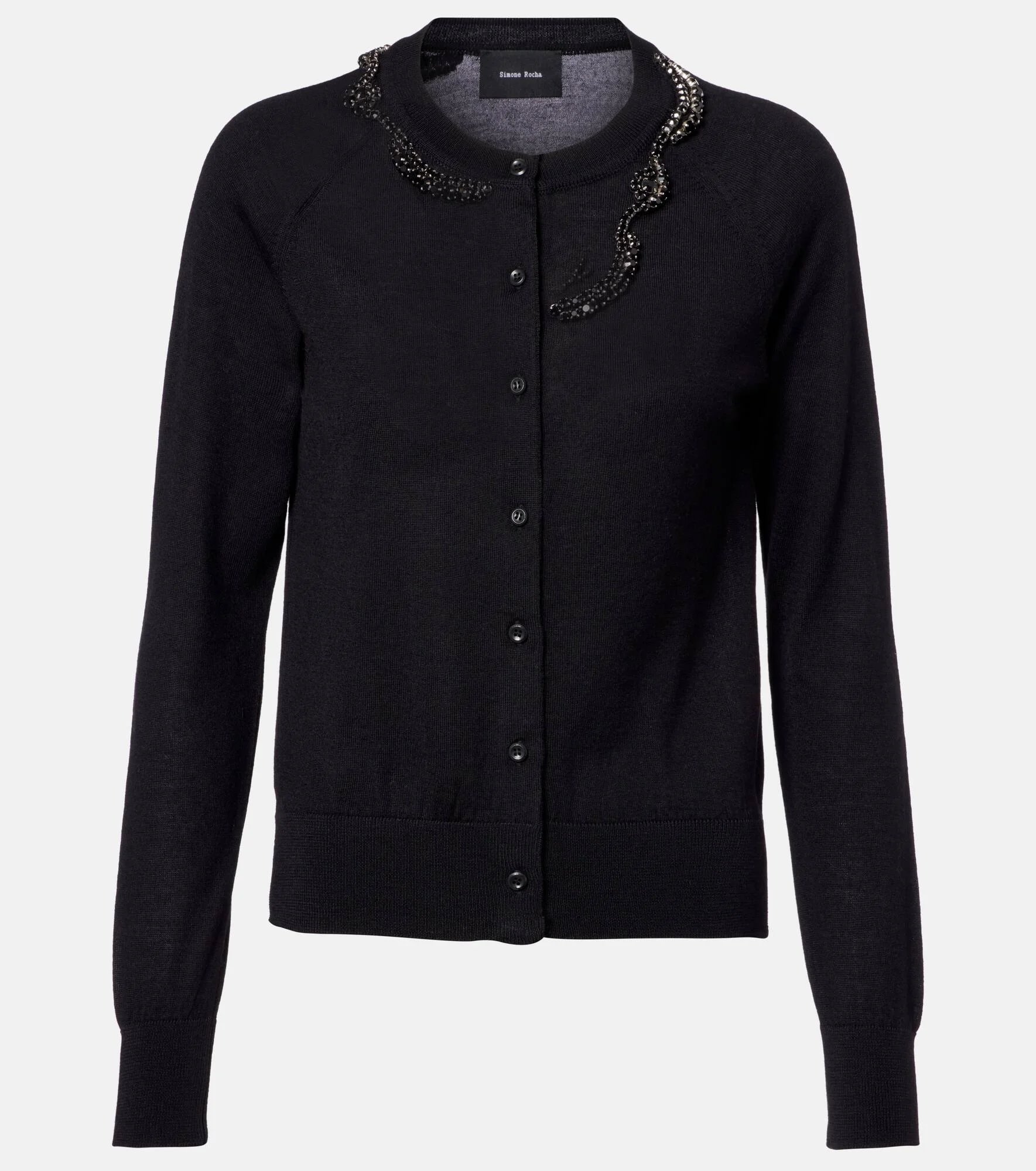 A mainstay at London Fashion Week, Simone Rocha's artful aesthetic is a subversive take on romance. Expertly knitted from sumptuous wool and silk, this timeless cardigan is complete with exquisite crystals and faux pearls at the neckline. Product Details - Material: 75% wool (merino wool), 25% silk - Care instructions: hand wash - Made in Portugal - Color: black - Designer color name: Black/Jet - Cuff: ribbed - Hem: ribbed - Item number: P01146255 Size & Fit - True to size - Cinched waist - Stretchy fabric - Slightly cropped - The model seen in the picture is 178cm-5'10" and wearing a size XS
