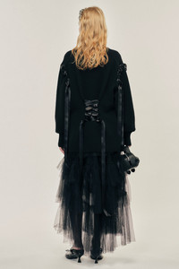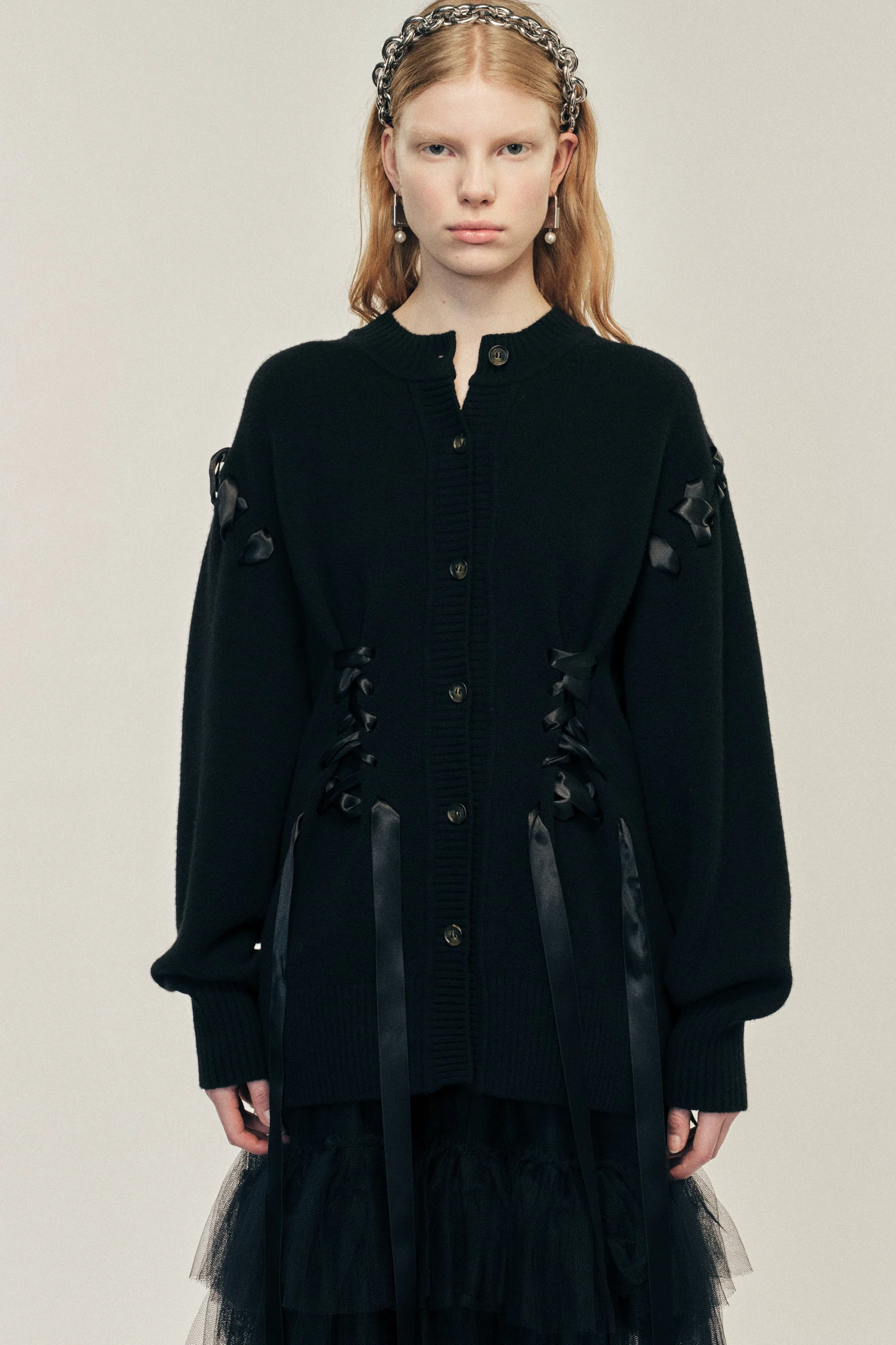 This cardigan features a corset-inspired design with satin ribbon details laced throughout. The voluminous sleeves and oversized silhouette creates a dramatic sculpted shape with the ribbon lacing. The model is wearing this style with the Long Tutu Skirt. Product Details Virgin wool knit cardigan - From Look 27 on the runway - Laced ribbon detail throughout - Front button placket - Relaxed fit Composition: 93% Merino Wool 6% Nylon 1% Elastane Ribbon: 100% Polyester SKU: LMK8 0660 BLACK Size & Fit Model is wearing size Small.