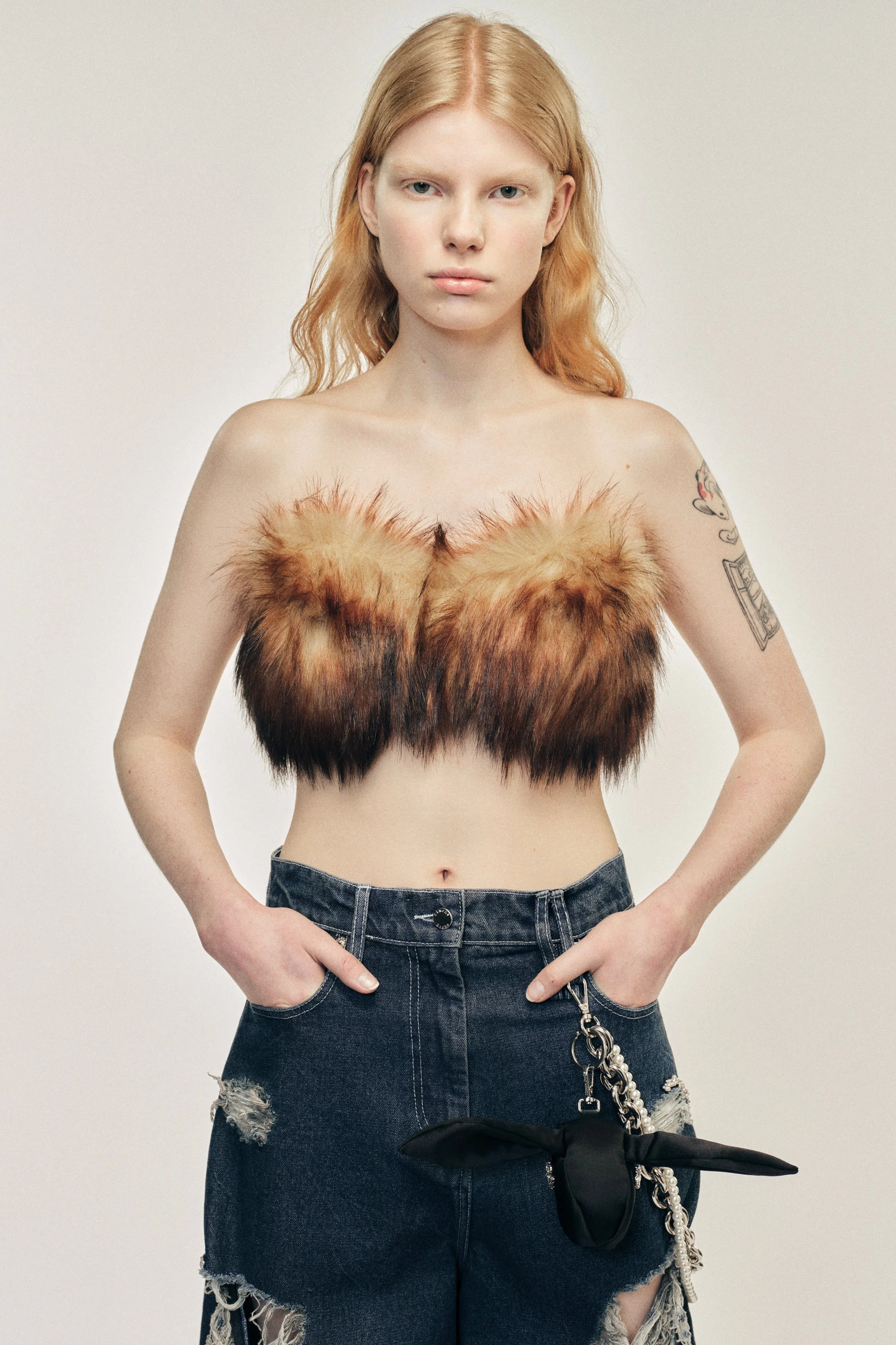 The faux fur bandeau top features a textured design with a subtle ombre effect. This strapless style definitely makes for an eye-catching statement piece. The model is wearing this style with the Embellished Wide Leg Puddle Jeans. Product Details Faux fur bandeau top - From Look 49 on the runway - Faux fur composition throughout - Sweetheart neckline - Adjustable hook-eye fastening at back Composition: 48% Modacrylic 39% Polycarbonate 13% Polyester Lining: 100% Viscose SKU: 5395 1255 NATURAL Size & Fit Model is wearing size 6.