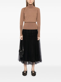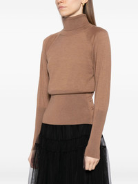 fitted high-neck top Highlights - Camel brown - Long sleeves - Ribbed cuffs and hem - Wool-silk blend Imported Composition Merino 75%, Silk 25% SIZE & FIT Model measurements Height 5 ft 10 in(1.77 m) Bust/Chest 30.31 in(77 cm) Hips 36.22 in(92 cm) Waist 24.8 in(63 cm) FittingInformation Designed for a slim fit that sits just away from the body offering a close yet comfortable fit Made with a lightweight knit, this piece offers some stretch Washing instructions Hand Wash