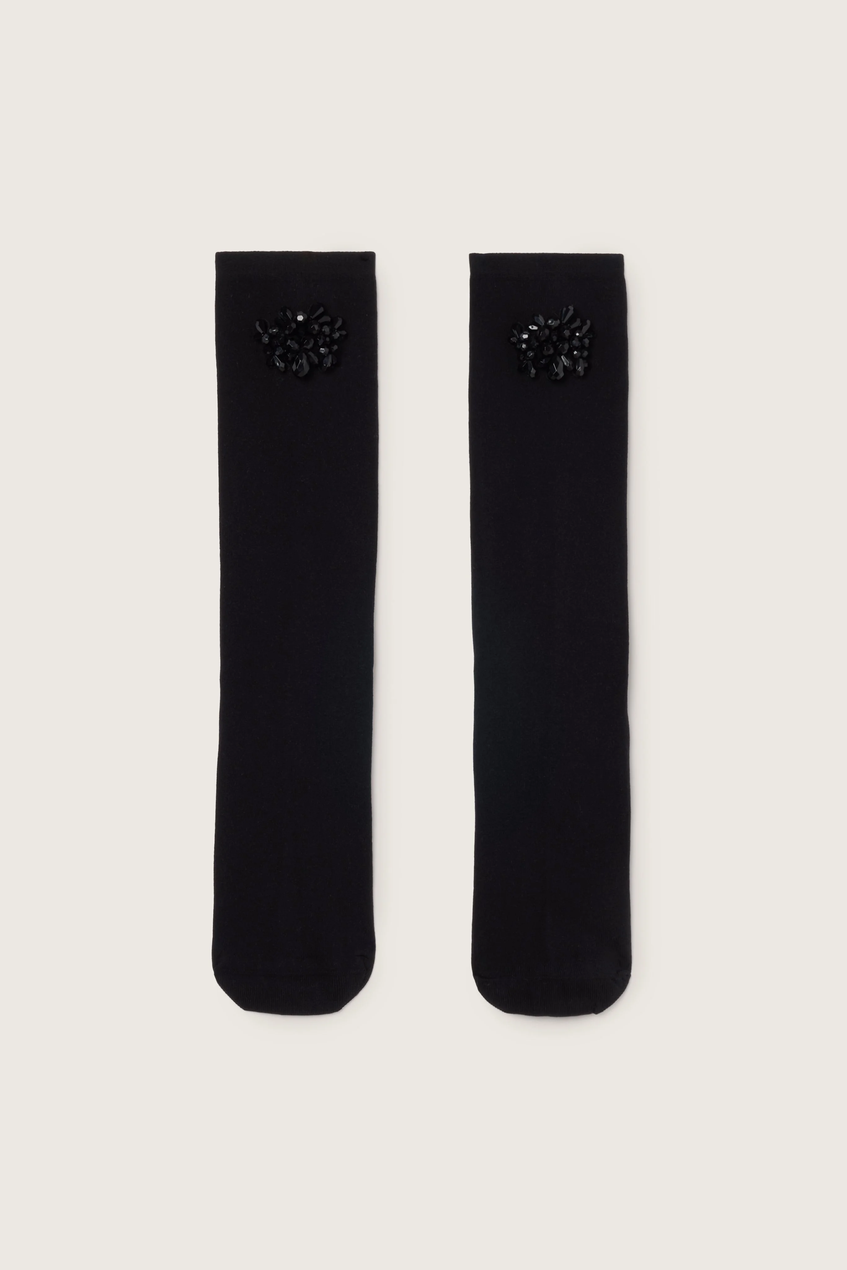 A pair of medium weight knit socks featuring a a cluster of jet black beading to resemble a bouquet of flowers. Embellished socks have become a signature accessory for Simone Rocha. Product Details Knit socks - Signature embellishment - Ankle length Composition: 98% Nylon 2% Elastane (Excluding Embellishment) SKU: SOCK67B 0639 BLACK/JET