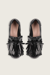 Simone Rocha's classic Tracker Ballerina is updated with a new polished leather upper and reimagined into a loafer. It features layered fringe at the front with a bow detail. Product Details Low trek patent leather loafers - Fringed detailing at vamp - Classic tracker sole - Heel height 6cm Composition: Upper: 100% Leather Lining: 100% Leather Sole: 100% EVA SKU: HT21 0740 BLACK