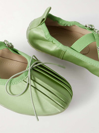 EDITORS'NOTES Simone Rocha's ballet flats are equally feminine and sporty. Made from lustrous satin and grosgrain, they have dainty bows and pintucked pleats at the round toes and shimmering crystals adorning the elasticated crisscross straps. The gripped rubber soles will keep you steady on slick surfaces. SIZE & FIT - Fits true to size, take your normal size - Italian sizing DETAILS & CARE - Slight heel - Mint satin and grosgrain - Slip on - Designer color: Matcha