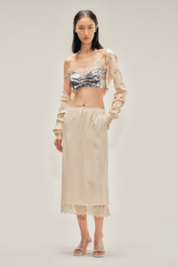 The Lace Trim Negligee Skirt is a new addition to the brand's underpinnings, featuring an elastic waistband and an a-line fit for ease and signature lace trim. Product Details Crepe de chine midi skirt - From Look 18 on the runway - Elasticated waist - Pockets at side seam - Floral lace trim Composition: SELF: 73%AC 27%SE LINING: 100%CU TRIM: BASE: 100%PA THREAD: 100%PL SKU: 3183 0514 NUDE