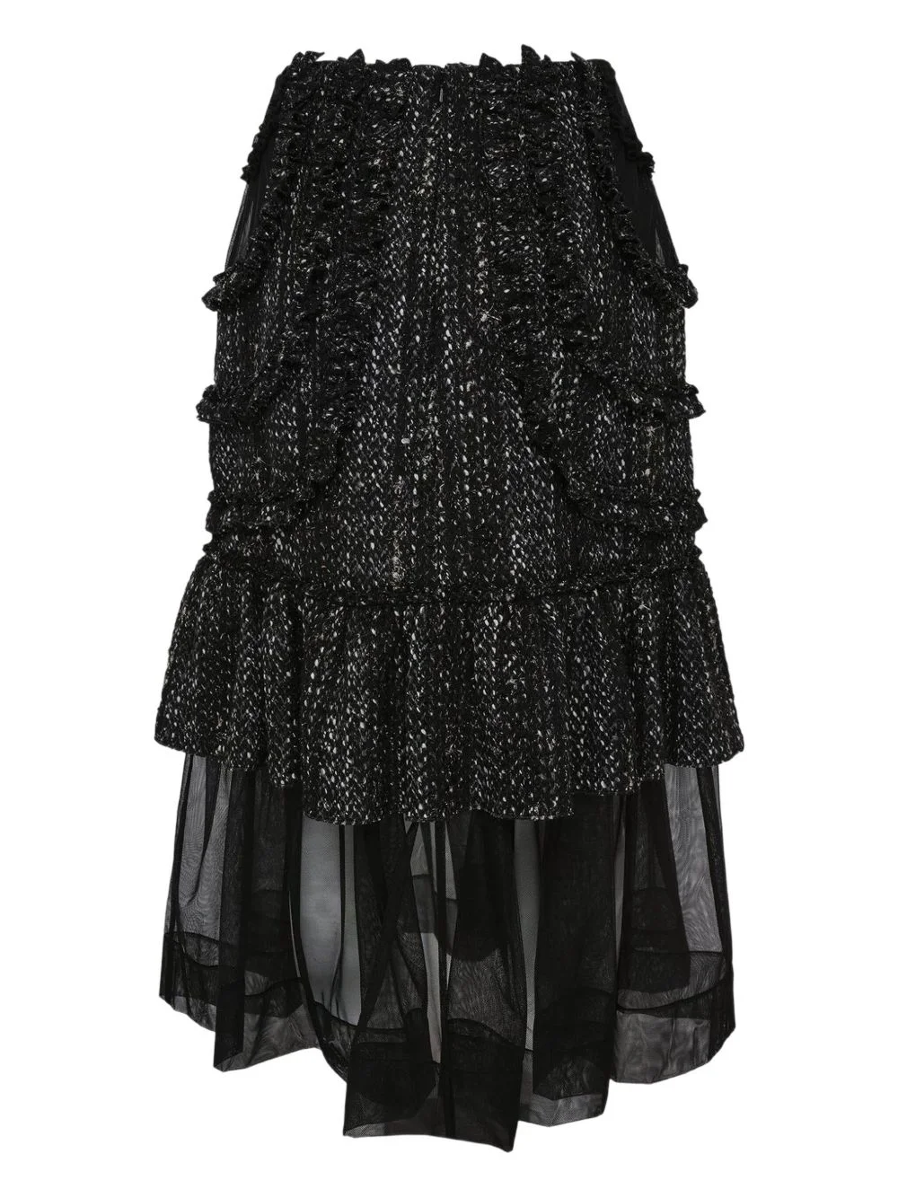 multi-frill patchwork midi skirt Highlights - Black - Frill details - Tiered design - Side pockets Imported Composition Acetate 60%, Polyester 42%, Cupro 40%, Polycarbonite 23%, Virgin Wool 17%, Cotton 10%, Nylon 7%, Viscose 1% Washing instructions Read Manufacturer Guidelines