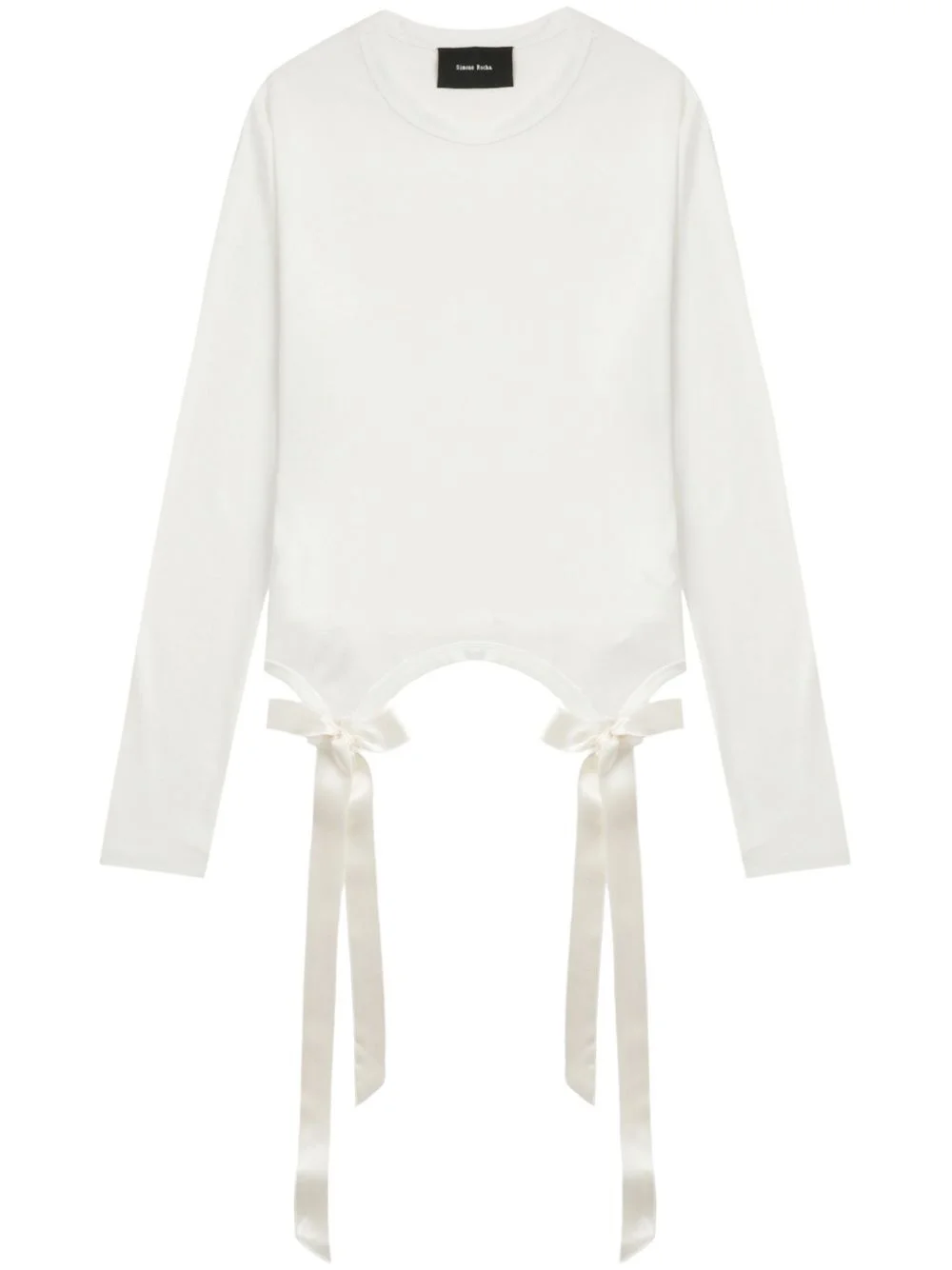 bow-detail top Highlights - White - Crew neck - Long sleeves - Semi-sheer construction Imported Composition Lyocell 100% SIZE & FIT Measurement SLEEVE LENGTH 24.8 in(63 cm) LENGTH 18.11 in(46 cm) BUST 31.49 in(80 cm) Shoulder Width 12.99 in(33 cm) FittingInformation Designed for a slim fit that sits just away from the body offering a close yet comfortable fit Made from a lightweight non-stretch fabric, this piece offers minimal elasticity when worn