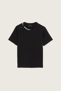 A relaxed fit t-shirt featuring a seasonal pearl and chain embellishment along the neckline with a signature bow. Product Details Cotton jersey t-shirt - Seasonal pearl and chain embellishment - Relaxed fit Composition: 100% Cotton (Excluding Embellishment) SKU: 5342B 0553 BLACK/PEARL
