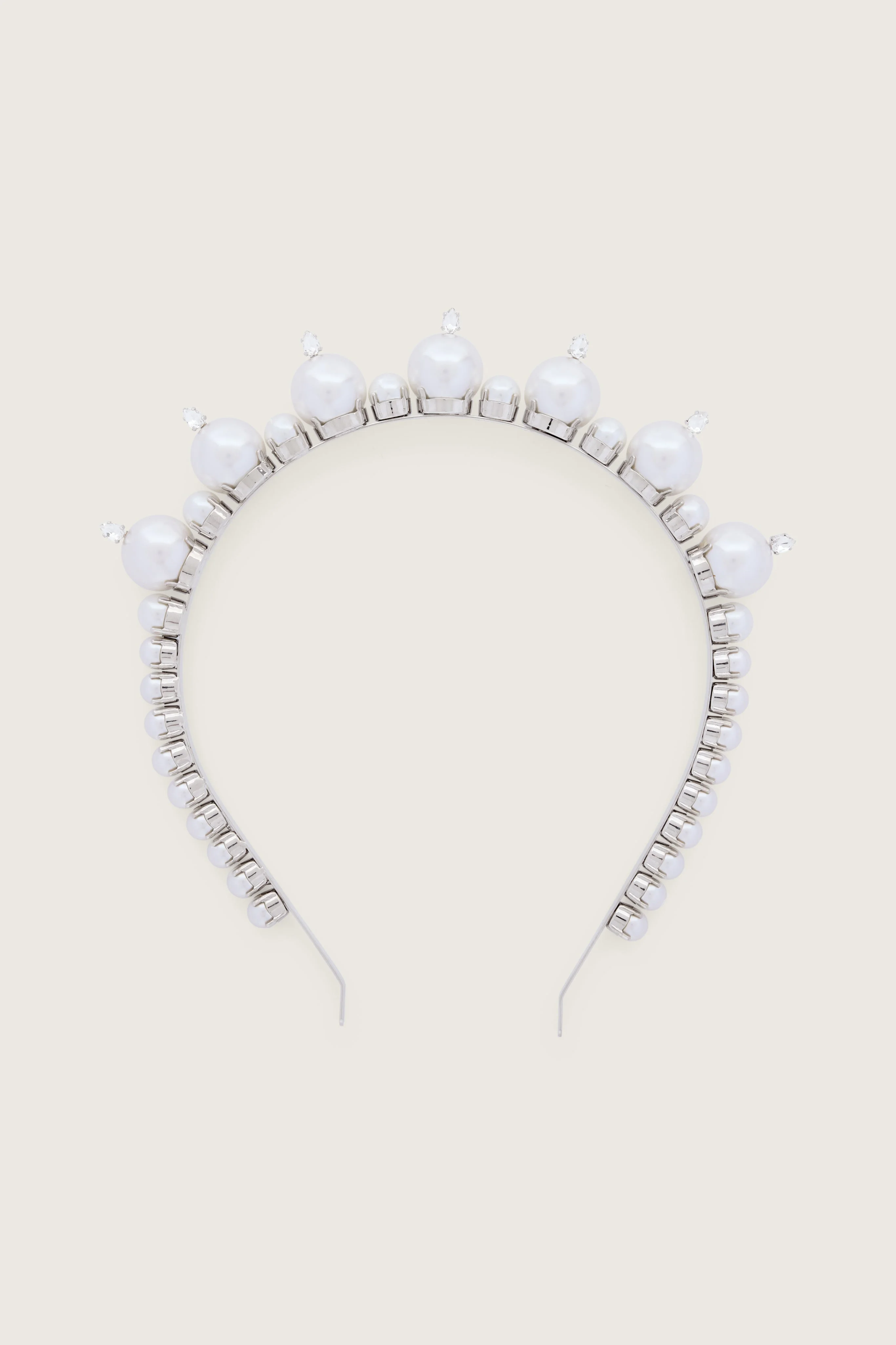 Pearl and crystals have become significant tropes to Simone Rocha, this hairband is constructed from a silver-tone rhodium in the form of a tiara. Product Details Pearl and crystal hairband - Signature embellishment - Logo embossed Composition: 45% Faux Pearl (Resin) 15% Glass Crystal 40% Brass SKU: HB44 0906 PEARL/CRYSTAL