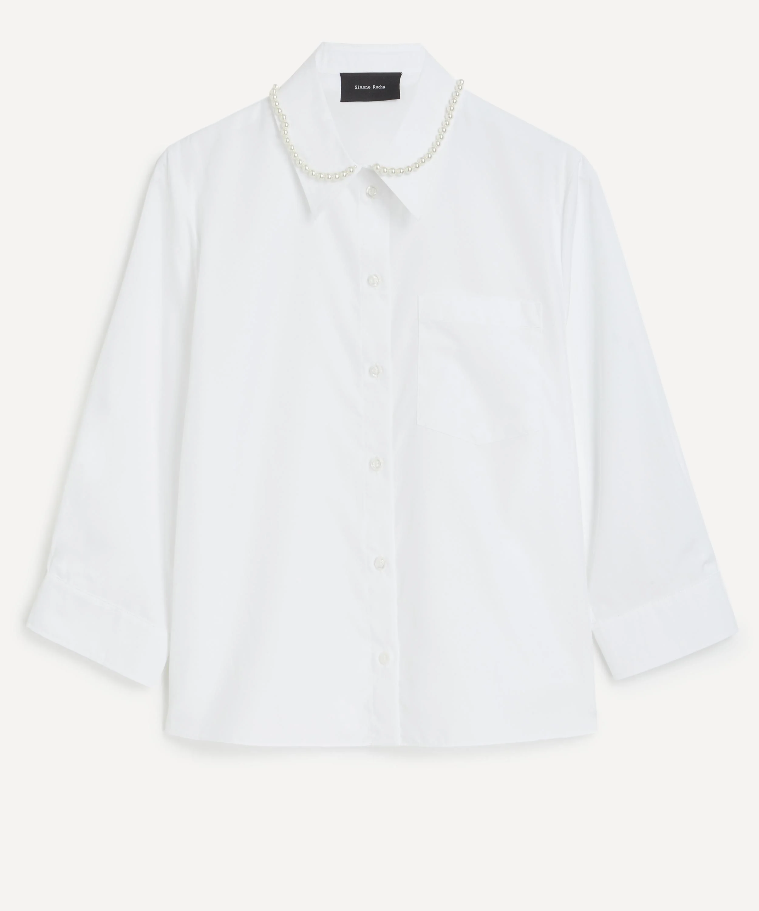 DETAILS Cotton poplin shirt Regular fit Cropped length Pearl-embellished spread collar Front button fastening Two-button barrel cuffs Shirttail hem SIZE & FIT Model is 175cm/5'9"; Chest: 77cm; Waist: 57cm; Hip: 87cm and wears a size 8 COMPOSITION & CARE 100% Cotton Dry clean