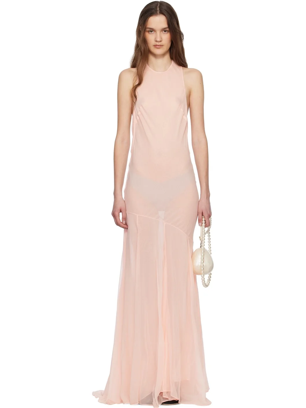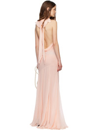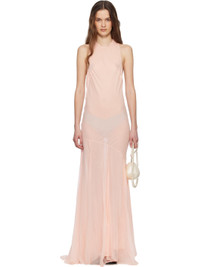 Sheer silk georgette maxi dress. · Bias-cut · Halter neck · Darts at chest · Asymmetric dropped waist · Slit and godet panels at flared hem · Bow accent and French-hook fastening at back collar · Draping at low back Supplier color: Powder pink 100% silk. Made in Portugal 251405F055001