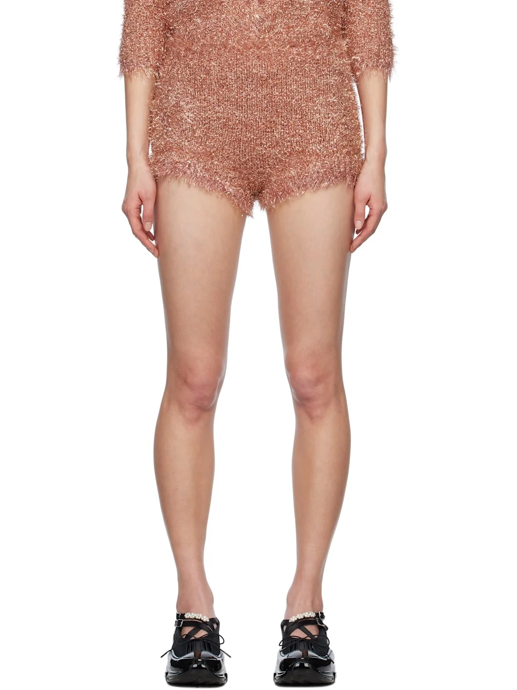 Shag-knit nylon-blend shorts. Metallic thread detailing throughout. · High-rise · Elasticized waistband Supplier color: Pink 55% polyamide, 45% metallized fibre. Made in Portugal 251405F088004