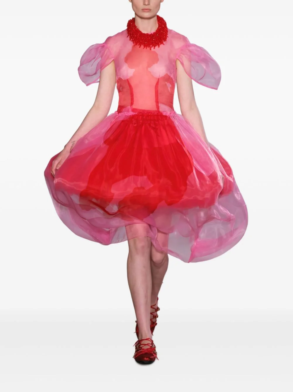 puff-sleeve sculpted-corset midi dress Highlights - Pink - Petal sleeves - Sculpted corset - Layered skirt - Sheer overlay - Lace trim Imported Composition Polyester 100% Washing instructions Read Manufacturer Guidelines