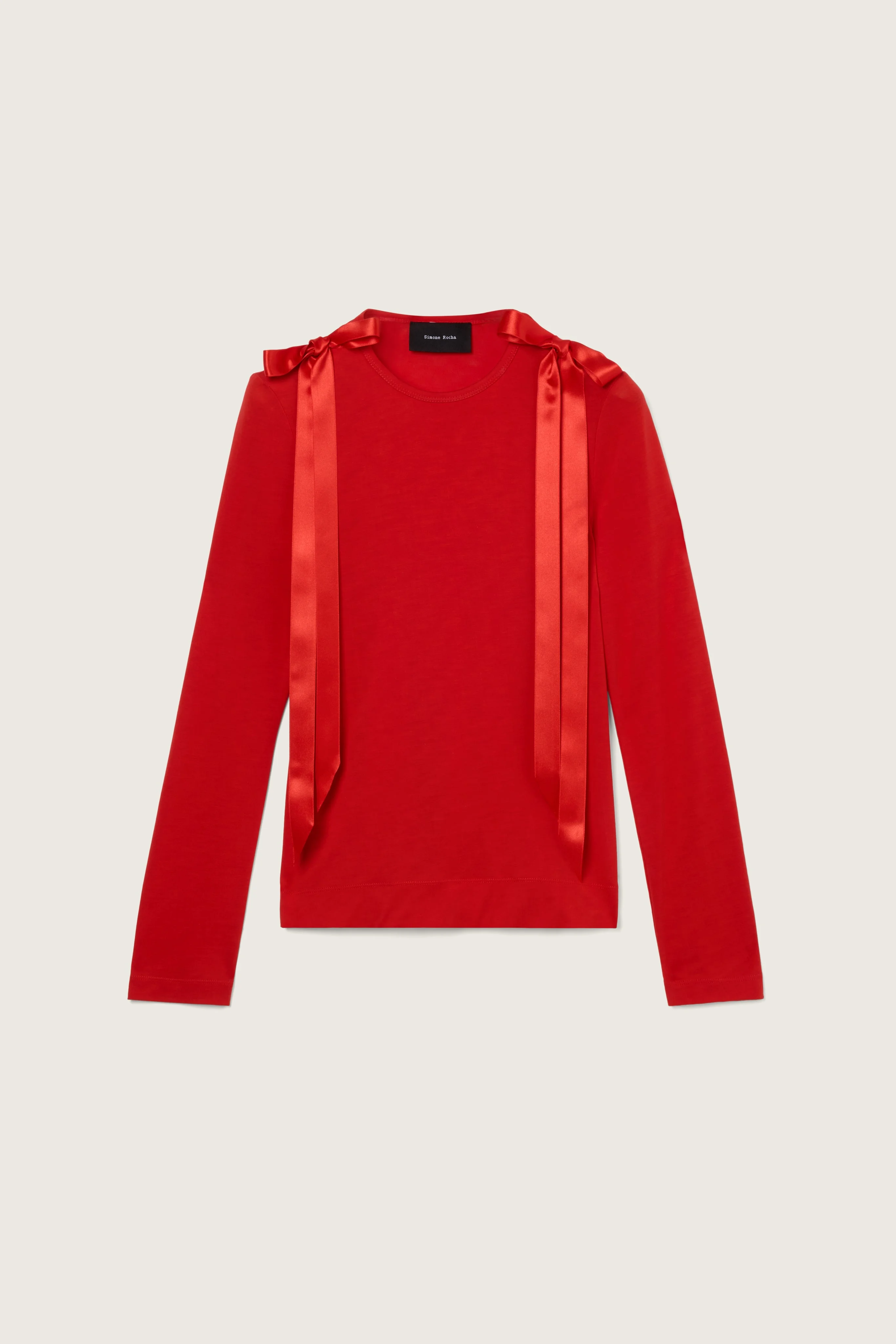 A long sleeve t-shirt composed of a lightweight jersey, decorative satin bow ribbons sit at the shoulder and drape down to emulate the runway looks. Product Details Fine jersey long sleeve t-shirt - Satin bow detail at shoulder - Relaxed fit Composition: Self: 100% Lyocell Trim: 100% Polyester SKU: 5367 0571 RED