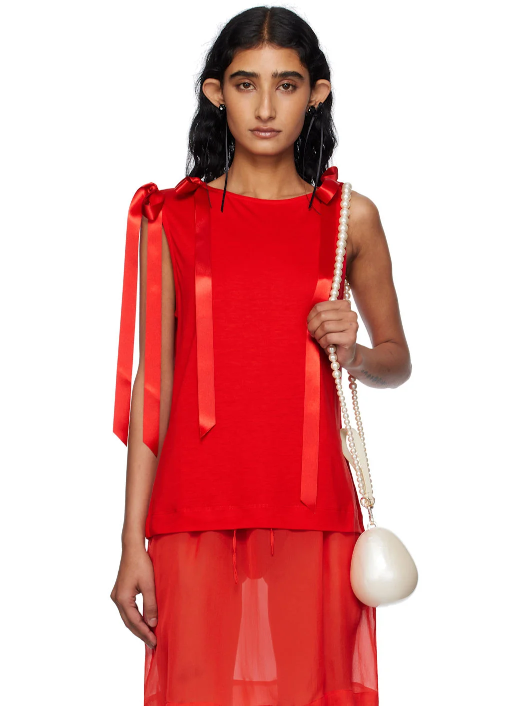 Lyocell jersey tank top. · Boatneck · Bow appliques at shoulders Supplier color: Red Body: 100% lyocell. Trim: 100% polyester. Made in Portugal 252405F111003