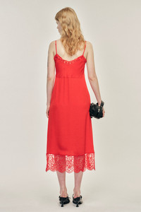 A slip dress made in a silk mix crepe de chine, a classic style from Simone Rocha. Featuring a floral embroidered lace trim and adjustable straps, the perfect layering piece to be worn under our sheer dresses. Product Details Silk mix crepe de chine slip dress - Sweetheart neckline - Floral embroidered lace trim - Adjustable shoulder straps - Gathered bust Composition: 73% Acetate 27% Silk Trim: 100% Nylon Thread: 100% Viscose SKU: 7210 0514 RED Size & Fit Model is wearing size 6.