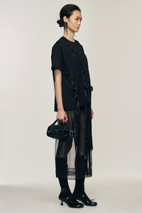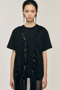 This t-shirt has an oversized fit and features a distinctive ribbon at the front, they hang down giving this style a deconstructed look. The model is wearing this style with the Sheer Bow Ribbon Pencil Skirt. Product Details Cotton jersey t-shirt - Laced ribbon detail throughout - Oversized fit Composition: Self: 100% Cotton Trim: 100% Synthetic Fibres SKU: 5368 0553 BLACK Size & Fit Model is wearing size Medium.