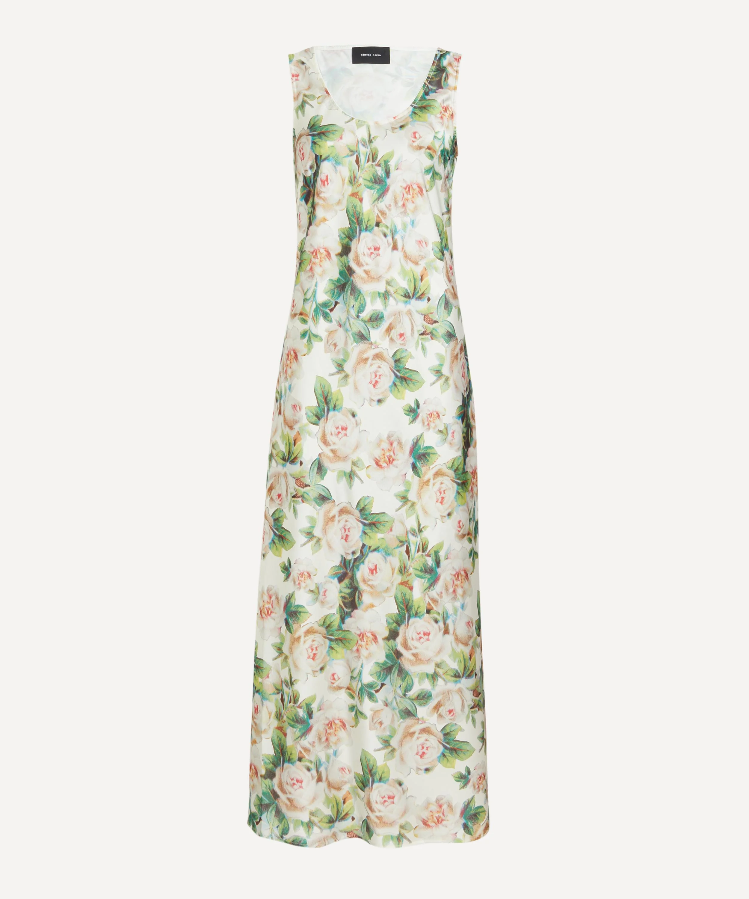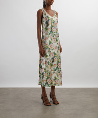 DETAILS Satin dress Slim fit Column silhouette Maxi length Scoop neckline Thin shoulder straps Fitted waist Flora rose print SIZE & FIT Model is 175cm/5'9"; Chest: 77cm; Waist: 57cm; Hip: 87cm and wears a size 8 COMPOSITION & CARE 97% Polyester; 3% Elastane Dry clean