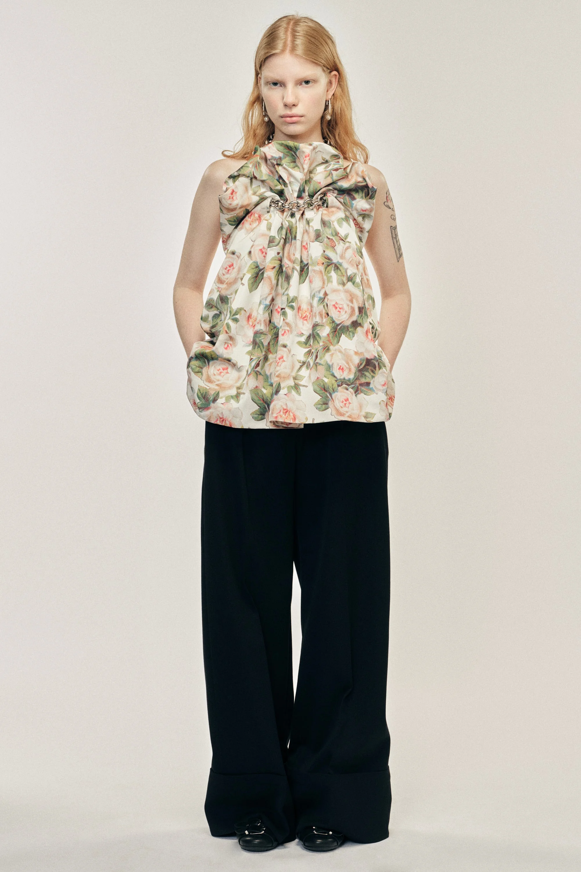 A dramatic halterneck top composed of a floral printed taffeta, it is hung with chain links whilst creating a structural shape. The model is wearing this style with the Multi Belt Loop Wide Leg Trousers. Product Details Floral print taffeta halterneck top - From Look 45 on the runway - Seasonal chain detail - Gathering detail at front - Pockets at side - Zip closure Composition: 100% Polyester Lining: 60% Acetate 40% Nylon (Excluding Embellishment) SKU: 5399 1280 ROSE Size & Fit Model is wearing size 6.