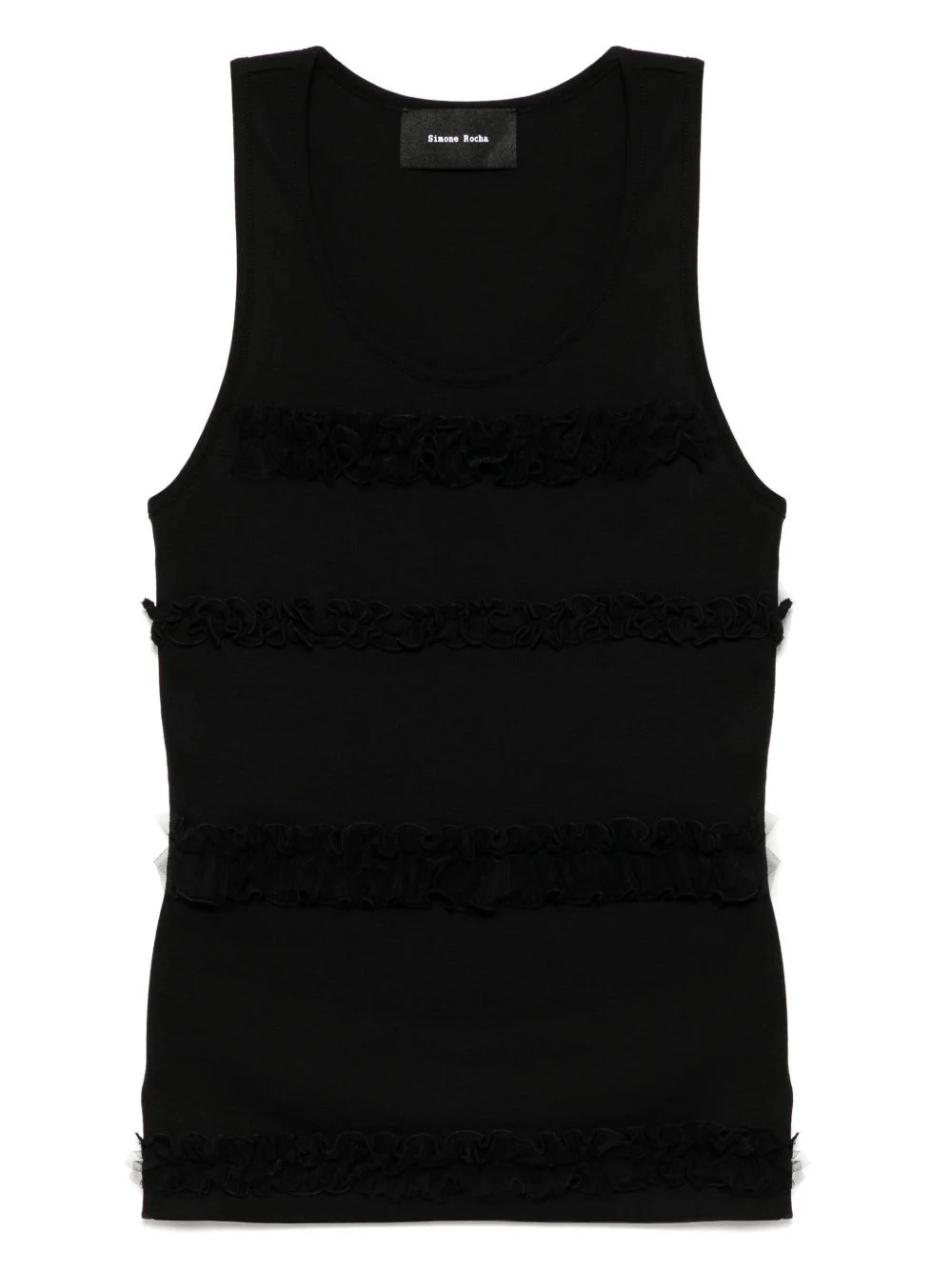 ruffled frilled tank top Highlights - Black - Ruffled detailing - Scoop neck - Sleeveless - Racerback Imported Composition Cotton 100% SIZE & FIT Model measurements Height 5 ft 10 in(1.77 m) Bust/Chest 30.7 in(78 cm) Hips 35.82 in(91 cm) Waist 21.25 in(54 cm) FittingInformation Designed for a slim fit that sits just away from the body offering a close yet comfortable fit Made from a midweight non-stretch fabric, this piece offers minimal elasticity when worn Washing instructions Hand Wash