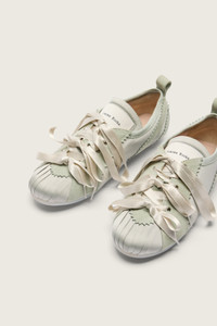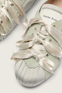 Introducing the Ballerina Grip Trainer, a new take on a ballerina pump with sporty references. It features multiple satin ribbon laces and a branded tongue. Product Details Low-top satin and leather sneakers - Satin bow ribbon lacing - Branded tongue detail - Rubber trek sole Composition: Upper: 50% Polyester 50% Leather Lining: 100% Leather Sole: 100% EVA SKU: BPT4 0814 DUCK EGG