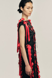 A tonal floral brocade dress featuring a corseted detail throughout with contrasting red satin ribbons. It has a distinctive patchwork construction construction that makes this piece truly special. Product Details Rose satin brocade dress - From Look 12 on the runway - Laced ribbon detail throughout - Tonal floral motif - Zip closure - Relaxed fit Composition: 100% Polyester Lining: 60% Acetate 40% Cupro Trim: 100% Polyester SKU: 7421 1236 BLACK/RED Size & Fit Model is wearing size 8.