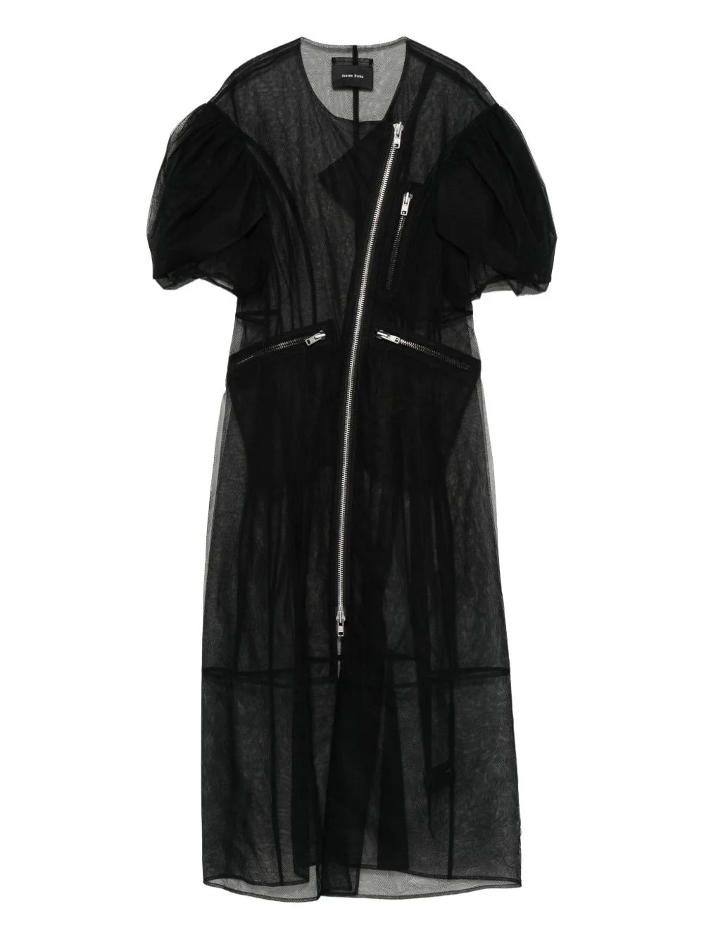 semi-sheer dress Highlights - Black - Petal sleeves - Zip front - Multiple zip pockets Imported Composition Polyamide 100%, Nylon 100% SIZE & FIT Model measurements Height 5 ft 11 in(1.8 m) Bust/Chest 31.49 in(80 cm) Hips 36.61 in(93 cm) Waist 24.4 in(62 cm) Washing instructions Hand Wash