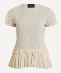 DETAILS Sheer tulle top Fits true to size Short puff sleeves Round neckline Flared peplum hem SIZE & FIT Model is 177.5cm/5'10"; Chest: 78cm; Waist: 58cm; Hip: 86cm and wears a size 8 COMPOSITION & CARE 82% Polyamide; 18% Elastane Dry clean