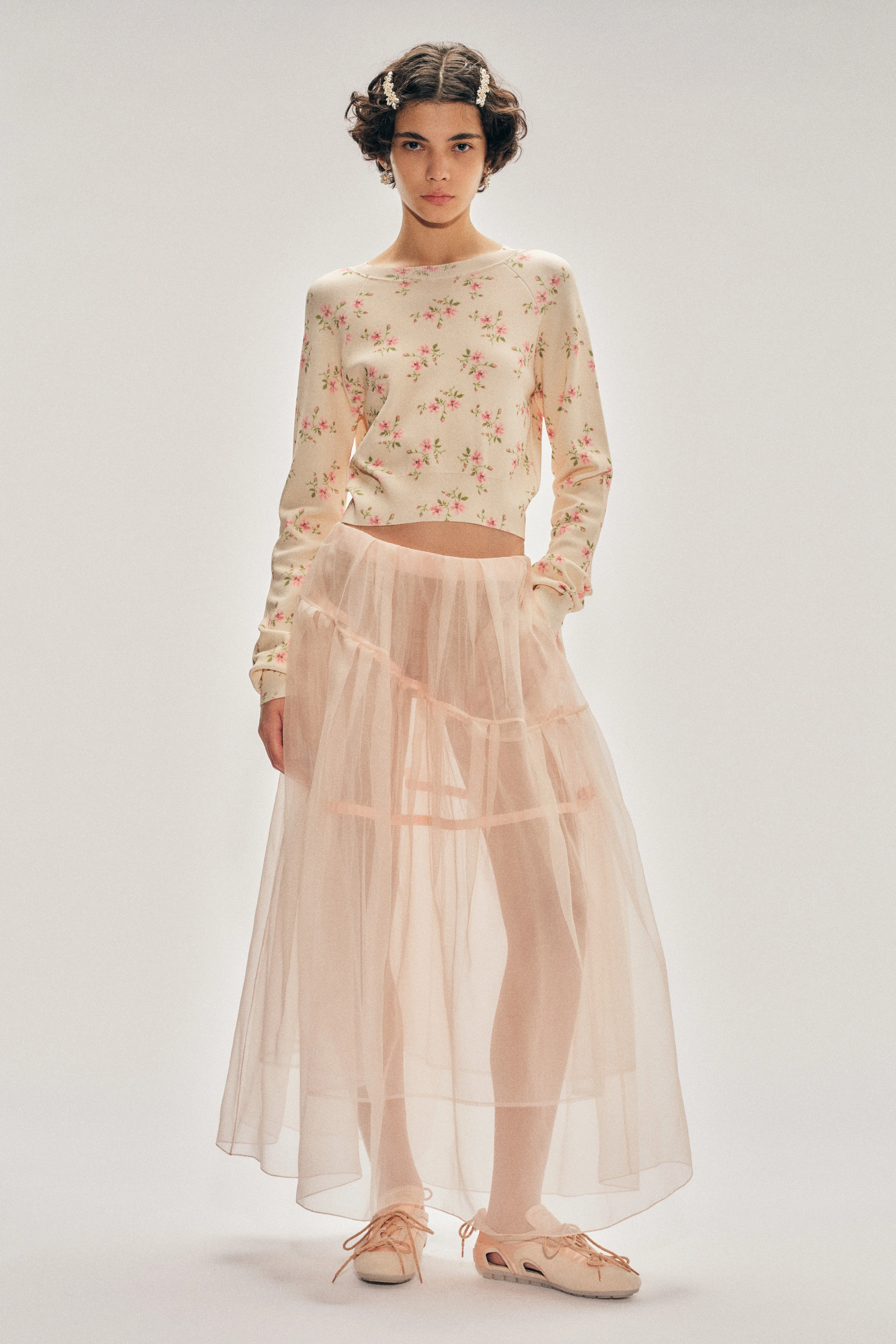 A flouncy skirt in silk organza with tulle underlayer for volume. Boning hoops sculpt the full silhouette, while side seam pockets and a fuzzy chenille bow add finishing touches. Product Details Silk organza skirt - From Look 17 on the runway - Seasonal chenille bow detail - Pockets at side seam - Zip closure Composition: SELF: 100% SE SELF2: 100% PA RIBBON: 100%CO SKU: 3179 0360 PALE PINK