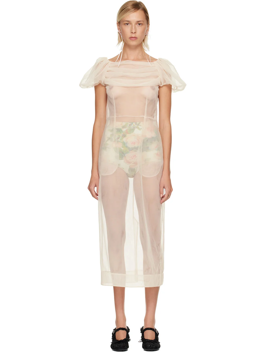 Sheer nylon tulle midi dress. · Boatneck · Draping and darts at chest · Seam pockets at waist · Puff sleeves · Zip closure at back collar · Central vent at back hem · Unlined Supplier color: Nude 100% polyamide. Made in Portugal 252405F054021