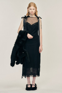 This delicate sheer tulle dress is designed to include black satin ribbons that create bows at the shoulder. The transparent fabric creates a gossamer effect throughout. The model is wearing this style with the Deep Lace Trim Slip Dress. Product Details Sheer tulle dress - Bow detail at shoulder - Cut-out detail at shoulder - Pockets at side - Zip closure at back Composition: 100% Nylon Ribbon:100% Polyester SKU: 7410 0069 BLACK Size & Fit Model is wearing size 6.